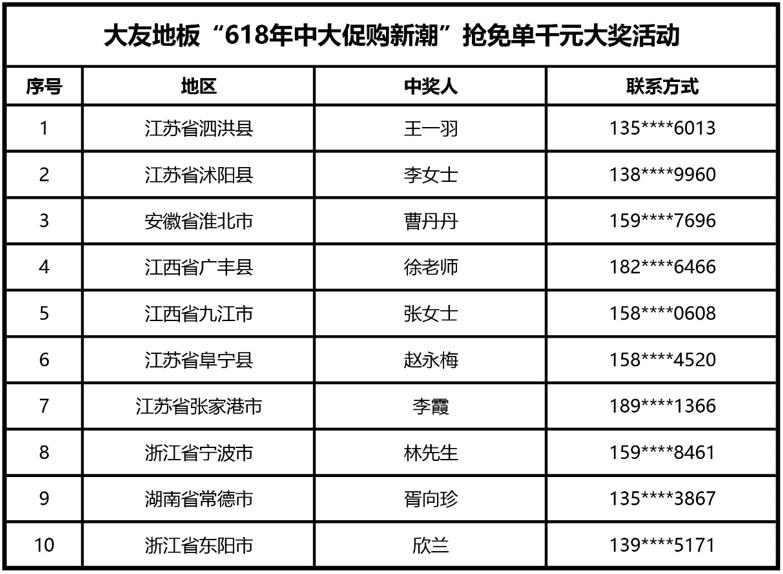 亚洲国产综合精品中文一区二区地板“618年中大促购新潮“抢免单千元大奖抽奖活动,通过亚洲国产综合精品中文一区二区地板官方抖音平台的直播,在所有消费者的见证下,抽取了本次活动的获奖名单。本次抽奖真实、有效,特在此公布,具体名单如下表: 请各位中奖者前往当地亚洲国产综合精品中文一区二区地板专卖店领取对应礼品